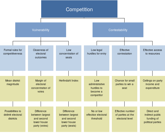 Vertical control of the government is established via free, regular, and competitive elections. Four components of democratic competition can be distinguished, two of which - vulnerability (component 1) and contestability (component 2) - best fit our middle-range concept of democracy and our idea of vertical control. Vulnerability corresponds to the uncertainty of the electoral outcome, which is indicated by the closeness of election results as well as the degree of concentration of parliamentary or legislative seats. Furthermore, formal rules have an impact on vulnerability: district size and the legal possibility of redistricting can influence competition. Contestability refers to the stipulations that electoral competitors have to meet in order to be allowed to enter the race. The effective competition in elections is measured by the existence and the success of small parties. Effective entry equals the total number of parties running for elections as well the ratio of parties who gain parliamentary seats.